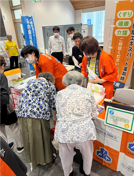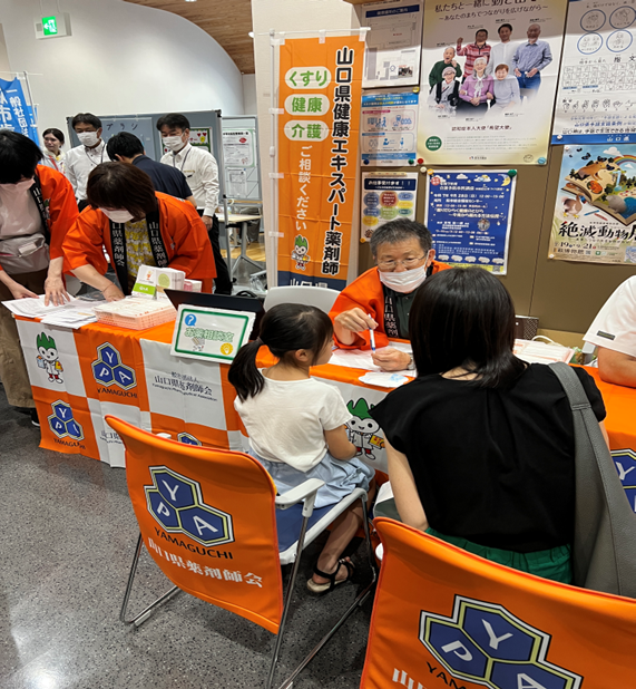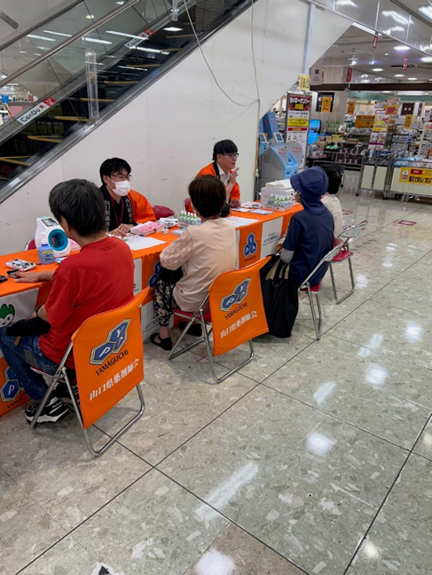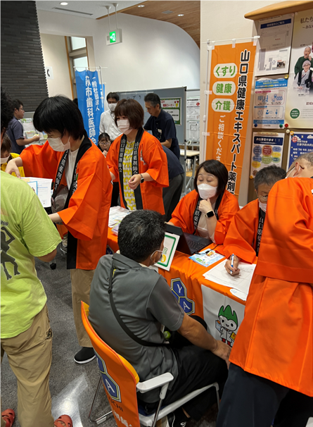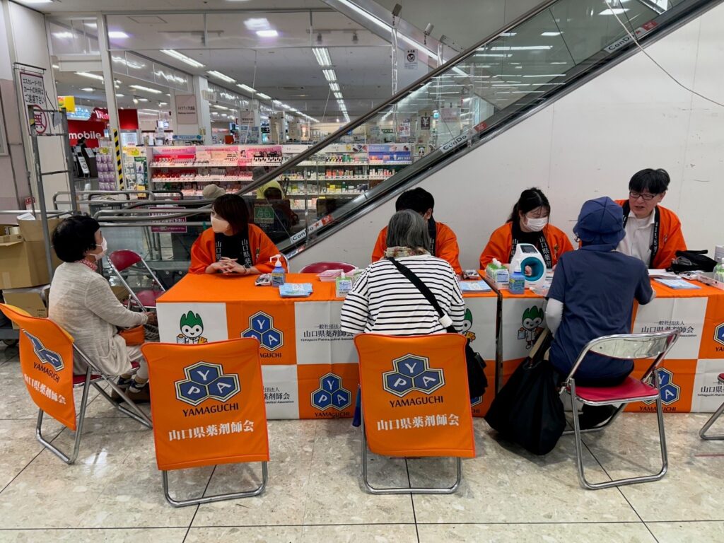 昨年度に引き続き、山口県健康エキスパート薬剤師による健康相談会が、8月3日(日)と8月24日(日)に県内4ヶ所の商業施設、総合福祉センター内にて開催されました。健康フェアの一環としての開催や、同会場で献血も行っていたりということもあり、多くの県民の方が立ち寄ってくださり大盛況でした。各種機器による測定を体験していただくことで自らの状態を知り、健康状態を維持していくために、エキスパート薬剤師がアドバイスや相談に対応いたしました。