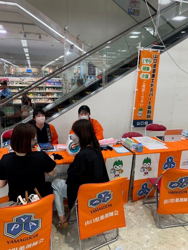 昨年度に引き続き、山口県健康エキスパート薬剤師による健康相談会が、8月3日(日)と8月24日(日)に県内4ヶ所の商業施設、総合福祉センター内にて開催されました。健康フェアの一環としての開催や、同会場で献血も行っていたりということもあり、多くの県民の方が立ち寄ってくださり大盛況でした。各種機器による測定を体験していただくことで自らの状態を知り、健康状態を維持していくために、エキスパート薬剤師がアドバイスや相談に対応いたしました。